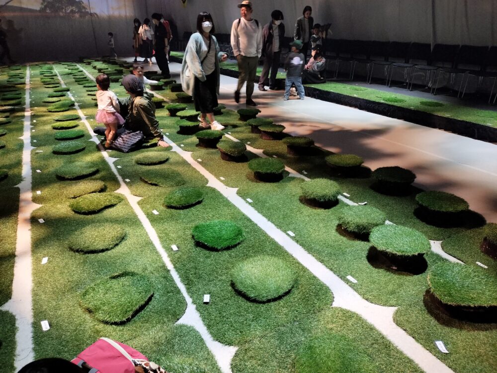 👉 床に敷かれた人工芝に座るスタイル