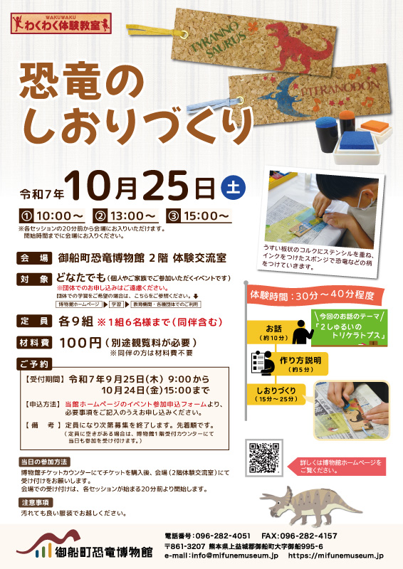 熊本県御船町|10月25日(土) わくわく体験教室『恐竜のしおりづくり』(事前予約要(受付中))