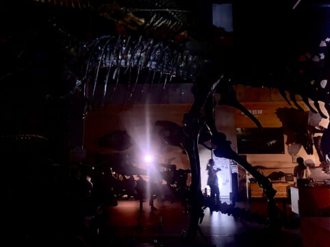 約100mの大展示室にて恐竜などの展示を見ながら生物の誕生・進化などについてナレーションを交えながら5分程度の光と音のショ―を開催します。