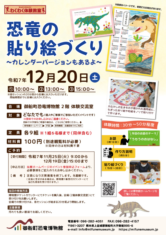 熊本県御船町|12月20日(土) わくわく体験教室「恐竜の貼り絵づくり〜カレンダーバージョンもあるよ〜」(事前予約要(先着順)・11/25 9:00申し込み開始)