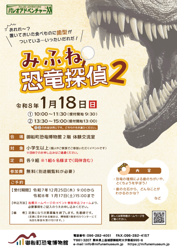 熊本県御船町|2026年1月18日(日) パレオアドベンチャー「みふね恐竜探偵2」(事前予約要(先着順)・小学生以上対象)