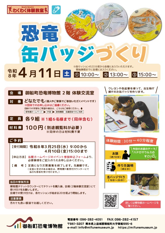 熊本県御船町|4月11日(土) わくわく体験教室『恐竜缶バッジづくり』(事前予約要・3/25申し込み開始)
