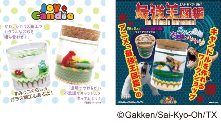 会場には恐竜のガラス細工の他アニメ「最強王図鑑」、「すみっコぐらし」のガラス細工をご用意しております。