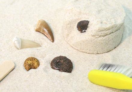 スティックやブラシを使って、砂ブロックの中から化石を掘り出そう!見つけた化石2個)はお持ち帰りできます。
