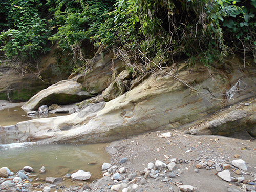 大岡道の駅で川沿いの崖の地層の見方、説明の方法を解説します。(20分)